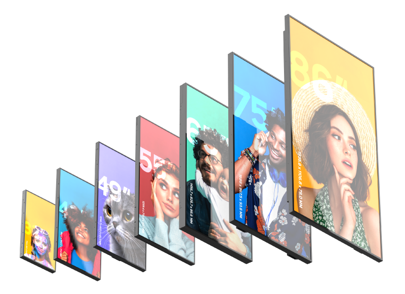EINE VIELZAHL VON GRÖSSEN UND VARIANTEN Eine Grösse passt nicht zu jeder Anwendung. DynaScan ist der einzige Hersteller in der Branche, der eine vollständige Produktpalette an High Brightness LCDs von 32″ bis 86″ in Standard- und Narrow Bezel Ausführungen anbietet. |