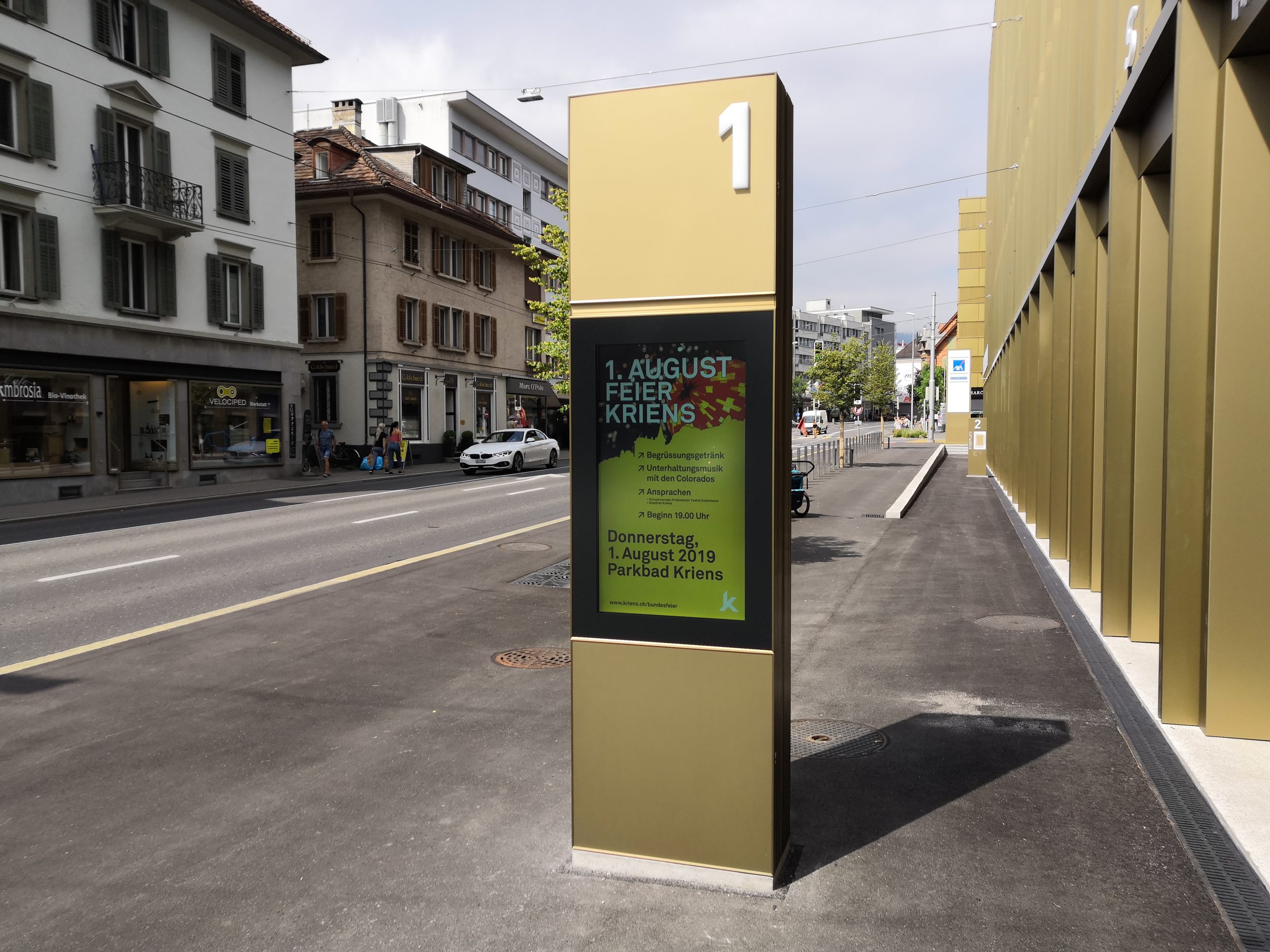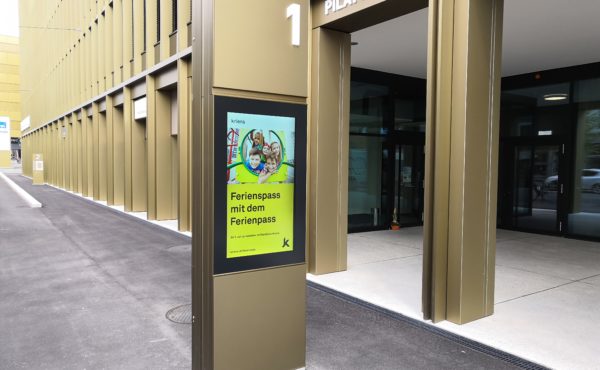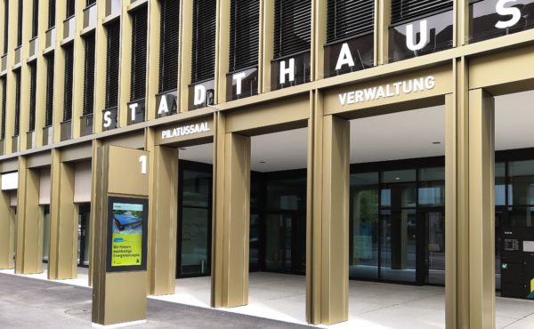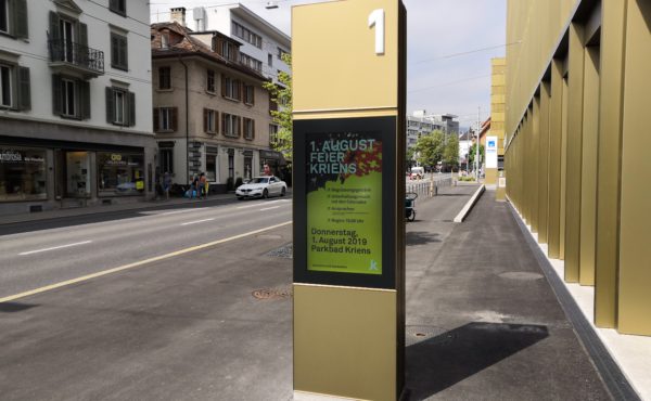 Die hochformatige 47-Zoll-doppelseitige Stele schmückt die Stadt Kriens. Sie dient als Besuchersystem – informiert Passanten und Bürger über Veranstaltungen, Stadtentwicklungen und über Bildung und Wohnen.